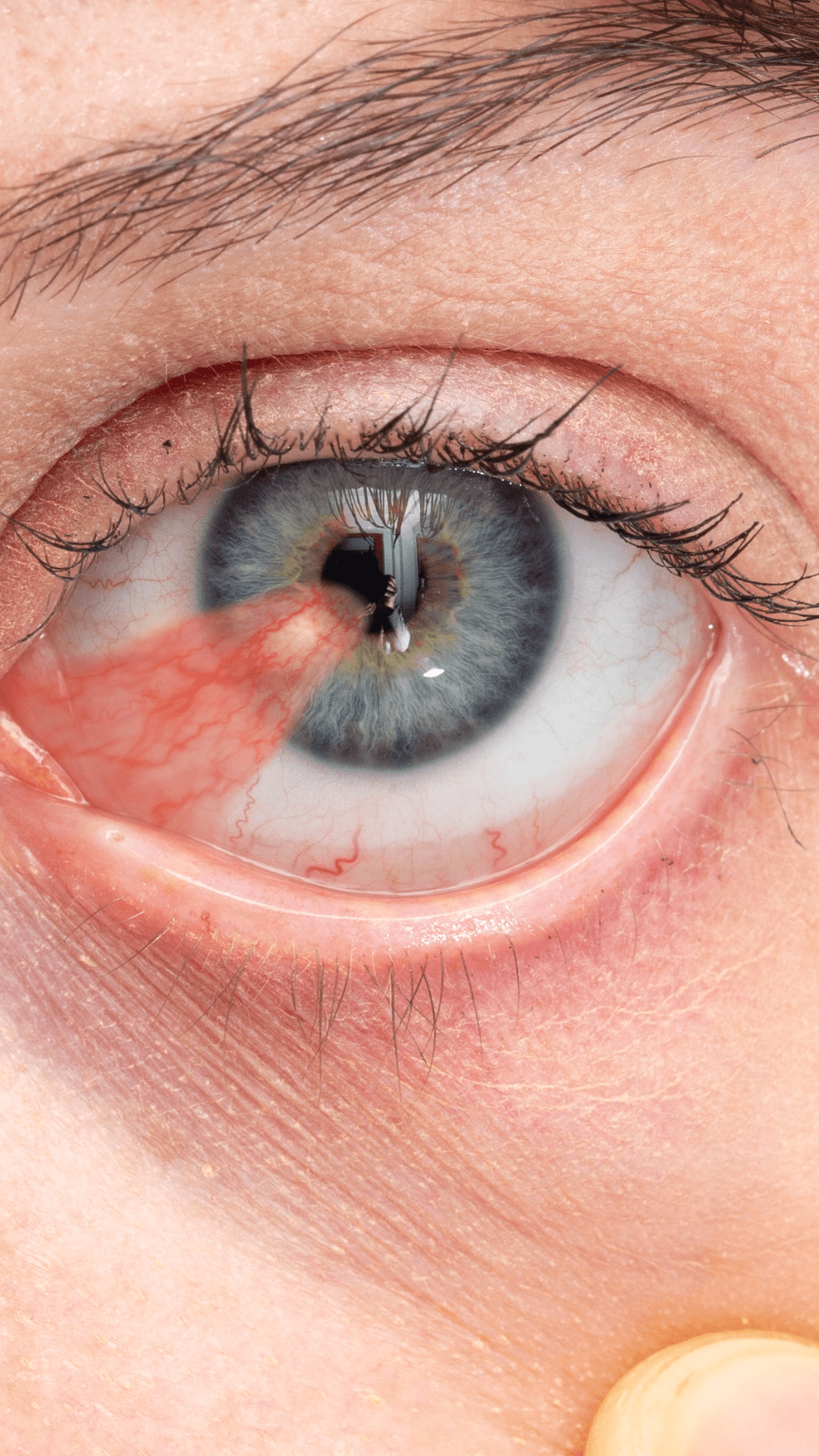 O pterígio é uma degeneração da conjuntiva, ocorre pela ação do meio ambiente (radiação ultravioleta, calor, químicas) ou traumática.